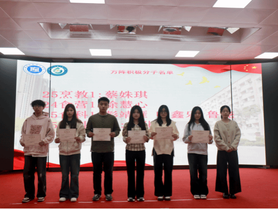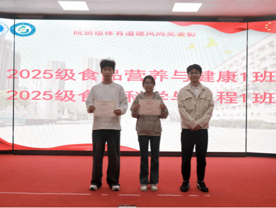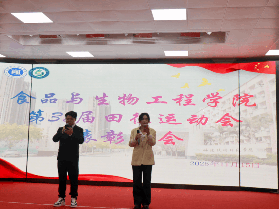 为总结第38届秋季运动会的赛事成果,进一步弘扬体育精神。2025年11月15日晚,我院于在科学楼金泰学术报告厅隆重举行了2025年第38届秋季运动会颁奖仪式。我院团委副书记庄舒敏 、2025级食品科学与工程1班班主任王瑞雪,2025级烹饪与营养教育(师范)1班班主任朱晓婷,2025级生物工程班主任彭品,辅导员、院团委、学生会主席团成员、全体运动员及各班学生代表共同参加了本次活动。