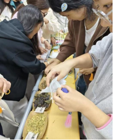 第一期手作工坊以“茉莉花环与香包”为主题,分为编织与缝制两个体验区。在茉莉花环手串编织区,同学们将洁白茉莉串连成环,在清雅的香气中感受“生生不息”的坚韧与“清香雅致”的高洁;在茉莉香包制作区,大家挑选干茉莉花、艾草等天然香料,穿针引线缝制出一个个精巧的香包。香包上绣有“平安”“奋进”等字样。同学们在缝制中体会耐心与细致,更将茉莉“奉献”“高洁”的精神一针一线“绣”入心间。