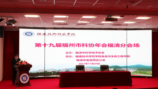 11月26日,由福清市科学技术协会主办,福建技术师范学院食品与生物工程学院、福清市食品同业公会承办,以“改革开放 创新引领——迈出科创中国新步伐”为主题的第十九届福州市科协年会福清分会场活动在我校科学楼学术报告厅举办。福清市科协主席林爱光、渤海大学副校长李建荣教授、福建技术师范学院副校长商光美研究员、宁波大学张进杰副教授、江西科技师范大学姚立华教授、苏虎副教授、福清市御冠食品有限公司黄大松副总经理、福清市医学会、畜牧兽医学会、康复学会、中医学会、护理学会、农技协等部门专家及我院领导班子、教师代表等出席会议。本次大会由我院行政主要负责人叶瑞洪主持,学院部分师生参加了本次会议。
