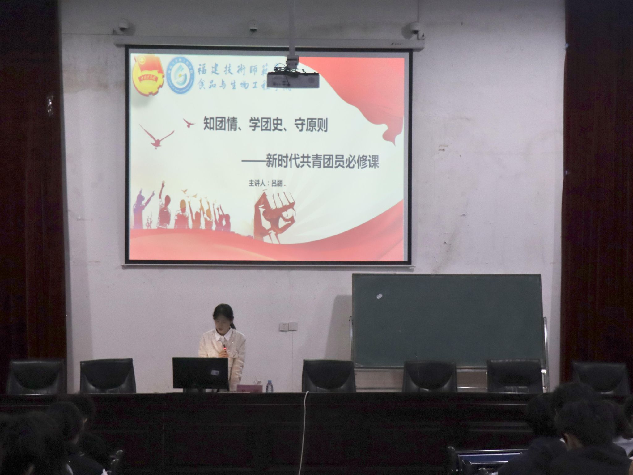 在团史回顾部分,吕丽老师带领大家重温百年青年运动的奋斗历程,强调共青团始终坚持民主集中制,凝聚一代代青年在革命、建设与改革中贡献青春力量,展现了青年命运与家国情怀的紧密相连。