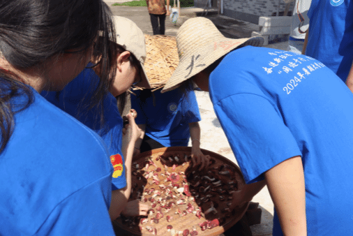 随后,实践队员们参观了红菇晾晒加工基地,这里是“随坪一里”团队的文创设计与农产品加工结合的典范。队员们不仅观摩了红菇的晾晒过程,还亲自参与到其中,利用自己的专业知识提出了创新设想,旨在提升农产品附加值,推动农业科技化,为两岸经济交流注入新的活力。