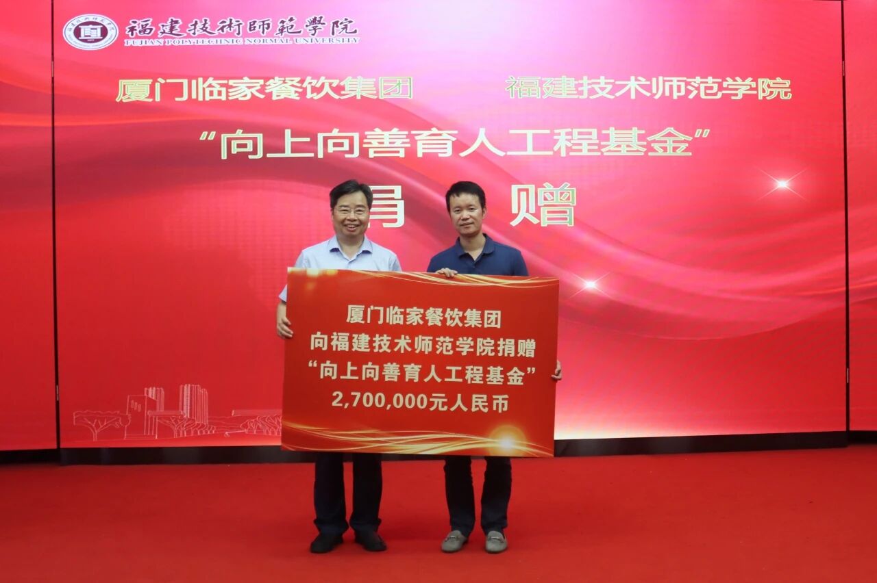 2021年6月11日下午,我校在五马山校区科学楼学术报告厅举行“福建技术师范学院向上向善育人工程基金”捐赠仪式。厦门临家餐饮集团董事长邱尚振、院长李娜、副院长韩晓楠,我校校长廖深基,党委副书记林海峰,副校长陈志勇,教务处、校团委、相关学院领导,首届获评的青年教师和学生代表以及食品与生物工程学院师生代表参加了本次会议。本次捐赠仪式由陈志勇副校长主持。