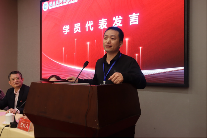 学员代表附属龙华职业技术学校张德宝老师发言,他对学校给予培训支持以及辛勤付出的领导、老师们表示衷心感谢,定将以空杯心态,珍惜机会,认真学习,为福建职业教育做出贡献。
