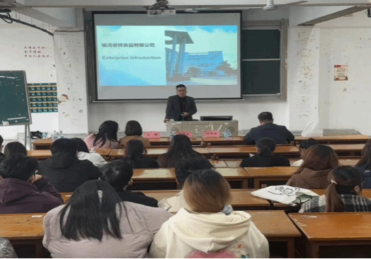 会议开始,福清睿辉食品有限公司代表蔡坤云总监首先对企业进行介绍,详细讲述了企业的服务理念和标准,随后向我院师生展示了企业的生产线和食品安全认证,体现了福清睿辉食品有限公司的强大实力。最后,通过问答环节,蔡坤云总监与学生积极互动,帮助学生更好地了解企业情况。
