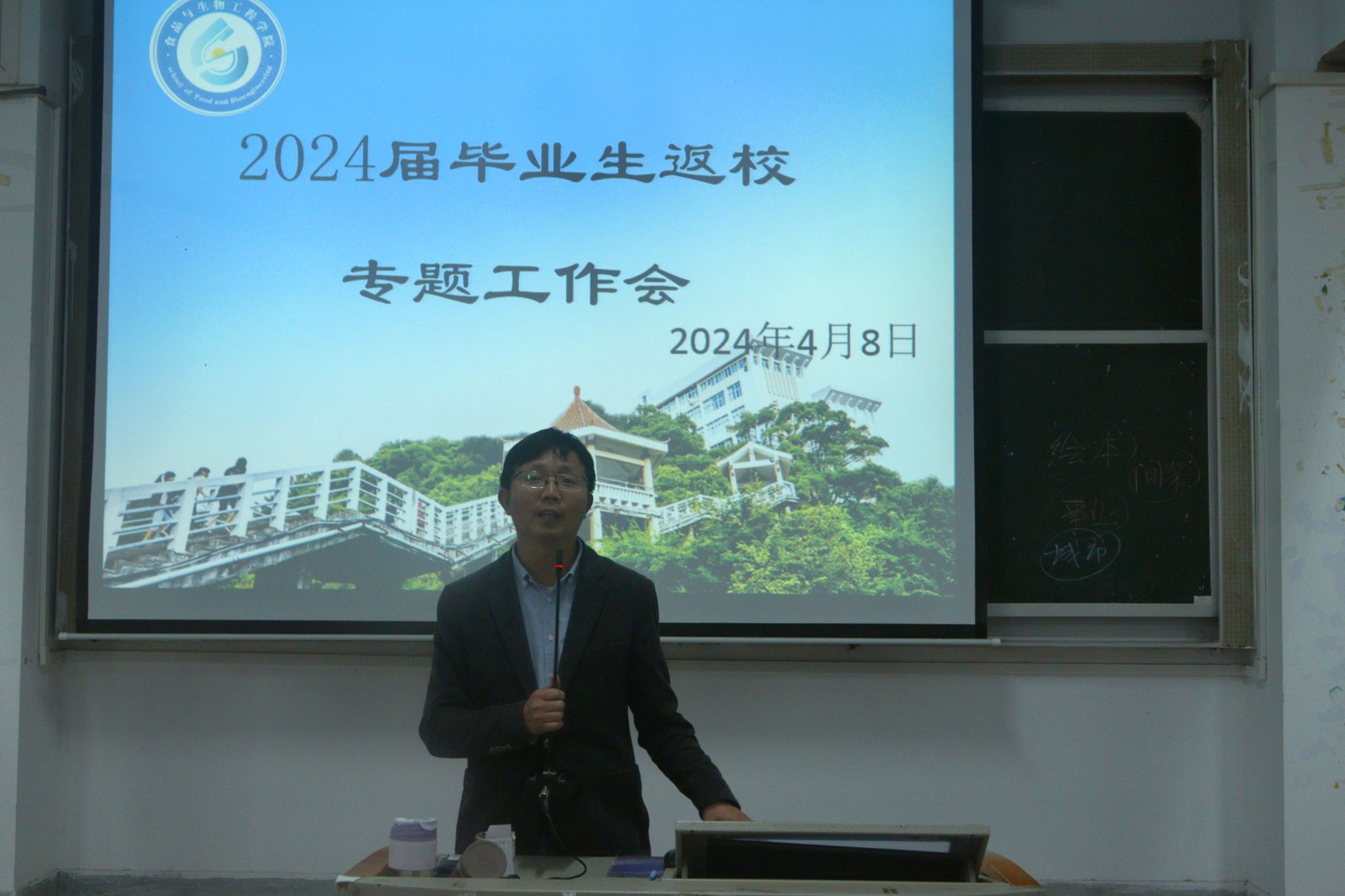 为合理安排毕业生返校后各项事宜,帮助2024届毕业生调整自身,敦促学生以独立、严谨的态度完成毕业论文、毕业就业等必要任务。我院于2024年4月8日召开2024届毕业生返校工作会议。会议在教学楼301召开,我院党委副书记林景亮、院长叶瑞洪、食品科学与工程专业主任黄迪惠、生物工程专业主任郭志英、院团委副书记庄舒敏和2024届未就业毕业生参与本次会议。