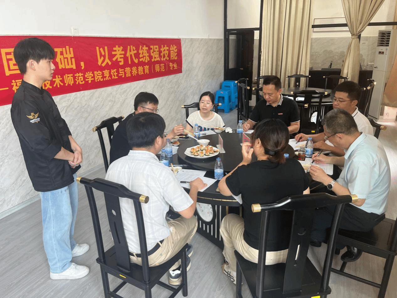 2024年6月12日上午,我院2023级烹饪与营养教育(师范)2班于石竹校区中式烹调室开展2023-2024学年第二学期《烹饪工艺学》课程“以赛代考”活动。学院领导高度重视本次活动,本次活动由任课老师郑金贵老师和黄义和老师组织,食品与生物工程学院院长叶瑞洪、书记林景亮、副院长施源德等院领导及各专业主任作为竞赛评委出席,23级烹饪与营养教育(师范)2班全体学生参加。